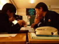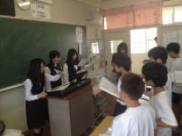3校時に,各クラスをのぞいてみました。1年生は家庭科で献立作りを学んでいました。毎日作ってくれるお家の方がどれだけ苦労されているかがよくわかったと思います。2年生は理科室で酸化銅について学習していました。実験をしながら化学反応式の仕組みについても学習していました。生徒も積極的に取り組んでいました。3Aでは,書写の授業でした。「自主創造」と筆を巧みに操りながら,真剣に取り組んでいました。書は心です。いい作品ができましたか?3Bでは公民の授業でした。初めて学ぶ科目です。今日は具体的にどんなことを学ぶのかというオリエンテーションでした。遺産の相続の話には興味深そうに身を乗り出して聞いていました。