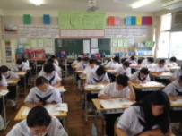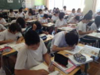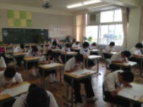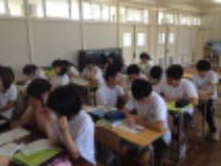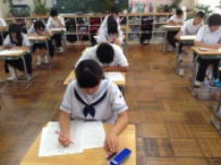 3年生は5教科の実力テストを行いました。朝,参考書を見ながら登校してくる3年生が何人もいました。また,朝の会前の教室では真剣に学習に取り組む姿が見られました。高校受験に向けて3年生にとっては一つひとつの試験が大切になってきます。自分の夢に向かってがんばって欲しいです。6校時には体育館で学友会集会が行われました。鰍朋祭に向けて各部門から内容の確認を行いました。暑い中でしたが,真剣に話を聞いていました。