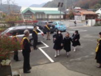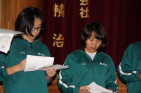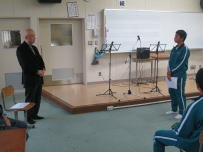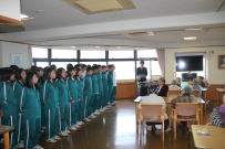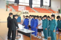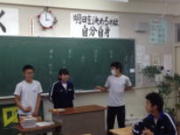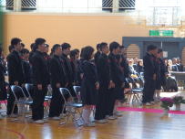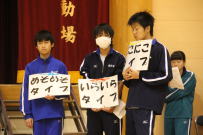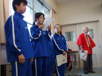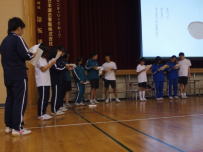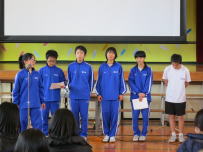 午前中,3年生はふじかわ荘を訪問し,お年寄りと交流をしました。福祉の現状を知るとともに,今の自分に何ができるのかを考えるきっかけになったと思います。緊張しながらも話しかけたりしている姿から優しい気持ちが伝わってきました。放課後,明日から始まる峡南地区新人大会に出場する1,2年生への壮行会が行われました。各部の部長が決意表明をした後,引退した3年生から激励の言葉が贈られました。学友会役員の力強い応援の後,最後に全校で円陣を組んで互いの健闘を祈りました。