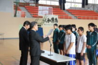 明日甲府市小瀬の中銀スタジアムで行われる「峡南地区総合体育大会陸上競技の部」の結団式を行いました。選手代表が大会に向けての決意表明をしました。今年のテーマは挑戦です。素晴らしい会場で個々のベスト記録が出せるように頑張ってきてください。鰍沢中学校の選ばれた選手としてプライドをもって行動しましょう。よい結果を期待しています。