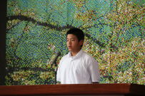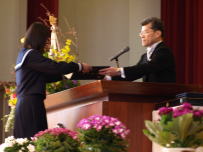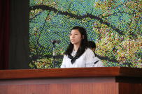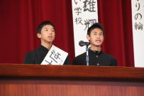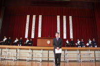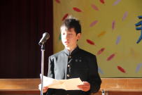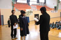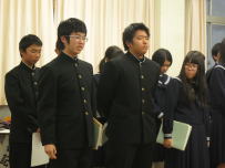 全校集会が開かれ,先日行われた新学友会役員選挙で当選した3名の生徒に選挙管理委員長から当選証書が渡されました。その後,新学友会役員に当選した生徒がお礼の言葉と決意を全校生徒に伝えました。正式には来月の学友会総会において3年生から引き継ぎをする予定です。今年度の学友会に負けないくらいの素晴らしい生徒会を創りあげてください。全校で応援します。