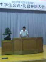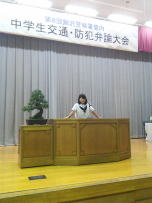 8月29日(金),市川南中学校において鰍沢警察署管内中学生交通・防犯弁論大会が行われました。本校からは3年生男女1名ずつが出場し,これまでの自分の経験をふまえながら主張を発表しました。忙しい中でしたが,夏休み中からしっかり練習した成果を出すことができました。防犯弁論の部で3位に入賞,交通弁論で努力賞をいただきました。応援ありがとうございました。