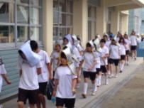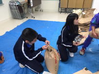 放課後,教育会館で各学校から集まった救援米の袋詰め作業とトラックへの積み込み作業が行われました。東京の倉庫に運ばれた後,アフリカのマリ共和国に船で送られます。峡南地区ではもう30年もこの活動を続けています。この活動を通して,「他人を思いやり,周りのことを考える気持ち」を育てています。今後も続けていって欲しいと思います。