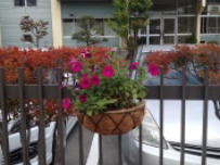 今年も1年生が花作りを行いました。5月下旬に種まきをして,大切に育ててきたものです。何度か植え替えをして大きくなったので,ハンギングバスケットで校舎南側のフェンスにつるしました。今年は赤色メインのペチュニアと黄色が鮮やかなマリーゴールドがきれいに咲いています。小さな種が大きく育ち,その過程に生徒たちも命の尊さを感じたと思います。ぜひ見に来てください。