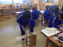 1年生の技術科の授業で木工の作品作りに取り組んでいました。自分が作りたいものをデザインして,設計して,一枚の板から作り上げていきます。慣れないノコギリに苦戦しながら真剣に取り組んでいました。いい作品ができあがるといいですね。