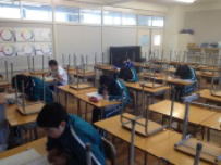 技術室では2年生が技術科で木工作品を仕上げていました。それぞれが本棚,ラック,小物棚を作っていて,今日は仕上げの工程で紙やすりで表面をきれいに磨いていました。とても丁寧で職人みたいにこだわっている生徒もいました。午後は木曜日の中間テストに備えて学習に取り組みました。1年生の英語では英語の教員が4人付いて質問等に応じていました。1年生にとっては初めての定期テストです。緊張しているかもしれませんが,頑張ってください。