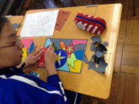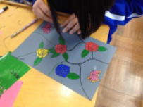1年生の美術の時間。今日は窓枠用のステンドグラス風の作品作りをしていました。自分たちでデザインした図案に上手に色をのせていきます。色鮮やかにそれぞれがていねいに作品を作っていました。窓に貼って光を通すととてもきれいな飾りができあがっていました。