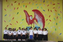 先日1年生全員で種まきをしましたが,かわいい芽が土の中から顔を出しました。1年生の教室の廊下で育てていますが,みんな興味津々で眺めたり,表面が乾かないようにスプレーをしたり,愛着を持って育てています。2年生の美術の授業では,階段アートに取り組んでいました。グループ毎に大きな絵を描いて,それを分割して階段に貼り付けます。階段を登っていくと1枚の絵をきれいに見ることができます。完成を楽しみにしていてください。