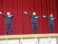 午後から体育館で3年生を送る会を行いました。学友会が中心になって企画運営を行い,1・2年生が力を合わせて準備をしてきました。前半は全校での楽しいレク活動を行い,和やかな雰囲気の中でたくさんの笑顔があり,楽しくできました。後半は3年間の懐かしいスライドを観て,楽しかった思い出を振り返るとともに心身ともに成長したことを感じました。最後に1年生の時の主任と担任からのビデオメッセージが流れました。3年生にとっては鰍中での生活も残りわずかです。最後まで素晴らしい姿を後輩たちに見せてください。