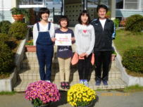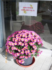 鰍沢小学校6年生の3名が、栽培している小菊を2鉢届けてくれました。中学生によく見えるように生徒玄関の入り口に置きました。大変きれいに咲き乱れる小菊を観ると心が和みます。鰍沢小学校の皆さん、ありがとうございました。大切にお世話をしていきます。