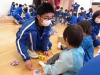 赤ちゃん抱っこなどを実施してきた「思春期体験学習」の続きで保育体験学習を3年生が行いました。学校の近くにある町第5保育所を訪れて、保育所の子どもたちと手作りのおもちゃで遊びました。3年生は子どもたちのまっすぐな行動に新鮮な驚きと喜びを貰いました。また、保育士さんたちの明るく穏やかな接し方にも感心しました。第5保育所の皆さんありがとうございました。