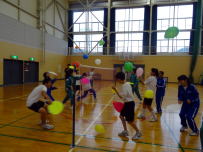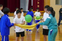 1学期には地区内にあるわかば支援学校ふじかわ分校に出向いて交流をしましたが,2学期は鰍沢中にきてもらいました。1年生が自分たちで企画,運営して進めていて,楽しく交流できました。合唱を披露したり,風船を使ったゲームで笑顔があふれていました。