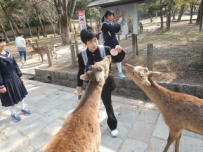 最終日の奈良では,全体での寺社巡りでした。この日の奈良はあまり人がいなくて,ゆっくりと見学することができ,全体写真もたくさん撮れました。南大門では,生徒が鹿せんべいを買ったとたんに物凄い数の鹿が一気に来て,生徒はかなり驚いていましたが鹿と楽しそうにふれあっていました。ガイドさんも分かりやすく,生徒に細かく説明をしてくれて更に学びが深まりました。2泊3日を生徒全員が協力して実りある修学旅行になったと思います。