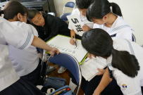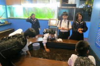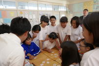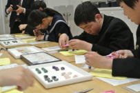 初日は全員で県内の施設をめぐりました。リニア見学センターでは時速500kmのリニアのスピードに衝撃を受け,富士山科学研究所では森を案内してもらい,森のエビフライも教えてもらいました。防災新館では信号を間近で見て,交通渋滞緩和をどう行っているかも学びました。またジュエリーミュージアムでは宝石を選んでストラップづくりをしました。話を聞くときはきちんとメモを取ったり,うなずきながら聞いたり,素晴らしい姿勢でした。