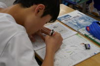 3年生の数学の時間は「星形」の角の和を求める授業でした。今までとは違う「円周角」を用いて考えるということで,いろんな広がりもあり,生徒も一生懸命,楽しそうに考えていました。