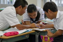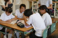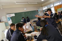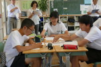 2年生の数学で連立方程式の授業でした。文字が3つ出てくる少しレベルの高い課題でしたが,グループで話をしながらクリアしていました。みんなで考えを出し合い,頭をフル回転して解いていました。