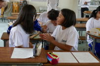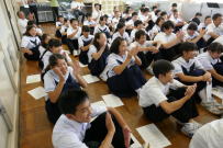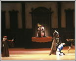 今年はシェークスピア作「ベニスの商人」でした。笑いをとるような場面も多くあり,生徒たちも楽しみながら劇のすばらしさを感じ取っていました。「役を演じている人の演技がとても上手で感動しました。こういうのを見てちょっと違う勉強をしてみるのにとてもいい機会だと思いました」(生徒感想より)