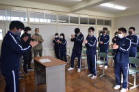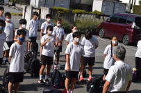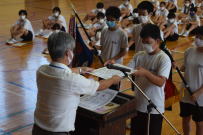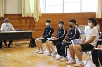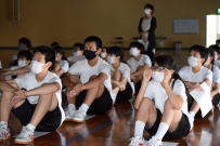 最後の地区大会へ臨む3年生にエールを送ろうと,本日の放課後,選手壮行会が行われました。応援するのは,1・2年生全員と3年生の吹奏楽部員。2年生の学友会本部役員と2年生有志から成る応援団が会をリードしました。応援団の堂々とした発声のもと,本来であれば大きな声で選手の背中を押してあげたいところなのですが,今年はコロナウイルス対策のため,全員で大きな声を出すことは叶いません。その分,拍手に気持ちをこめて選手にエールを送りました。程よい緊張感の中にも鰍中らしい温かさを感じる素敵な壮行会となりました。明日の大会では自分の持っている力を思う存分発揮してきてください。頑張れ!鰍中生!