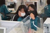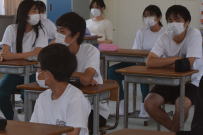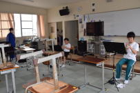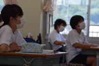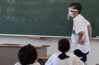 今日も朝からよく晴れています。12時現在の甲府は,南南西の風2.5m,気温は28.5℃。ここ鰍沢地区は富士川がすぐ近くにあり,風の通り道になっているせいか,ほどよい風が吹くおかげで(午後はおそろしく強力な風になることが多いですが…)午前中はそれほど暑さを感じませんでした。しかし,これから午後に向けて,じわじわと気温は上昇していきそうです。さて,今日は2時間目の1年生の技術科の授業をのぞいてみました。するとそこには,マスクに加えてフェイスシールドを装着した先生の姿が…。2時間目の時間帯とはいえ,マスクとフェイスシールドのダブル装着で話をするのは大変です。それを察してか,集中して先生の話を聴く1年生。コロナ禍の夏の教室。生徒も先生も共に頑張っています。
