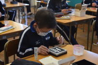 本日は1年生の美術の時間にお邪魔しました。1年生が現在取り組んでいるのは「コマ撮り動画」です。デジタルカメラで撮ったたくさんのコマ撮り写真をつないで1つの作品に仕上げます。アイデアがものを言うコマ撮り動画。どんな作品ができあがるのかとても楽しみです。作品発表会には是非とも招待をお願いします。