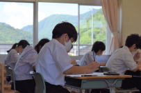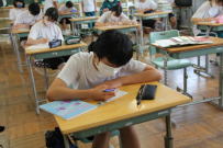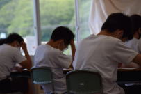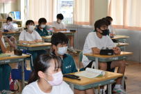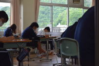 1・2年生は,いよいよ明日から期末テストです。2日間に渡って9教科のテストに挑戦します。テスト前日の放課後の2年学習会の様子を覗いて見ると,みな真剣に学習に取り組んでいます。一説によると人の脳が最も活発に働くのは起床して3~4時間後だと言われています。期末テストの開始時間は8時45分ですから,明日,あさっては5時台に起きることをお勧めします。そのためにも今日,家に帰ったらやるべきことをてきぱきこなし,できるだけ早めに床につきましょう。みなさんの頑張りを期待しています。