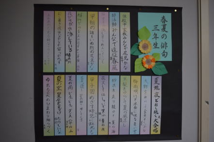 俳句とは,「古池や蛙飛びこむ水の音」のように,五・七・五の十七音で表現する詩の事を指します。最近では夏井いつき先生が出演するテレビ番組の俳句の才能査定ランキングなども人気の企画になっていますね。今,各学年の廊下に,自分たちが作った俳句が掲示されています。中学生独特の瑞々しい感性と視点で作られた俳句に,思わず立ち止まって読み入ってしまいます。中には今年ならではの俳句も見られます。秋冬編も楽しみにしたいと思います。