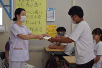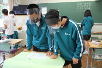 今日は3枚の写真についてお話します。1枚目の写真は,臨時休業による「おうち時間」をみなさんが過ごしていた頃,富士川町内の小中学校に勤務する給食調理員さんと用務員さんたちが町内の小中学生のために手作りしたマスクです。今朝の山日新聞にも載っていましたが,町内の小学生659人分と中学生387人分の計1046枚を本業の合間を縫って4月末から約1ヶ月ほどかけて作ってくださいました。みなさんの手元に届いた手作りマスクには調理員さんと用務員さんの愛情がこめられています。花粉症の季節も過ぎ,本来であればマスクとは疎遠になるこの時期になっても,今年はマスクが手放せそうにありません。有効利用するとともに,もしも調理員さんや用務員さんに会った時には,「ありがとうございました。」などと言えると素敵ですね。続いて2枚目の写真は,ちょっと分かりづらくなってしまいましたが,クリアファイルをフェイスシールドに変身させる魔法の型紙と,できあがったフェイスシールドです。3枚目の写真では,その手作りフェイスシールドを装着した生徒たちが掲示物作りを頑張っています。この夏は今まででは考えられなかった,マスクやフェイスシールドをあちらこちらで目にする夏になりそうです。マスク着用(フェイスシールド装着)と熱中症対策。相反する2つの難題に対して手探りしながら最善の策に行き着ければと考えています。