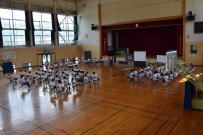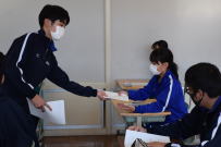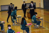 あさっては3年生の晴れ舞台,卒業式です。今日の1・2時間目は,1・2年生による卒業式の会場設営が行われました。3年生が気持ちよく卒業できる環境をつくりあげようと,1・2年生が心をこめて作業をし,立派な会場ができあがりました。新型コロナウイルス感染防止対策のため,座席の間隔は随分と離れてしまいますが,当日,会場に集う人たちの心はきっと1つになるはずです。第74回卒業式まで後2日です。