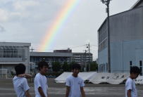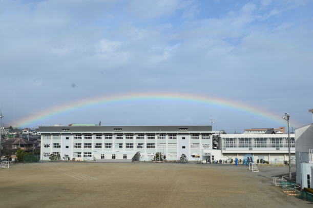 随分前のことのように感じますが,春先,学校は2ヶ月弱の臨時休業を余儀なくされました。何とか来年の3月までに教科書の内容を教えきるために,今年度はどこの学校も授業のやりくりに苦労しています。鰍沢中学校では,例年であれば休日となるはずだった11月20日を授業日に設定して6時間授業を行いました。朝から登校ゴミ拾いを頑張ってくれた生徒や選挙運動を頑張る生徒など,本来ならば休みのところを頑張る鰍中生を労うかのように虹のご褒美が現れました。お隣,鰍沢小学校の真上にきれいに架かった七色の虹。今日1日,みなさんよく頑張りましたね。