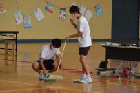 ペットボトルロケット(英語で「water rocket」)は,ペットボトルに水と空気を入れて圧縮し,一気に開放させることにより噴出する水と空気の反作用によって飛行します。昨日は3年生の理科の授業でペットボトルロケットの発射実験を行いました。今日の3枚の写真はその時の連続写真となっていて,2枚目の写真には見事に勢いよく飛び立つペットボトルロケットの勇姿が収められています。コロナ禍にあって窮屈な生活を余儀なくされているせいなのか,ペットボトルロケットが颯爽と大空へ向けて飛び立っていく姿に清々しさを感じました。