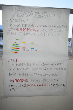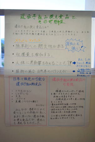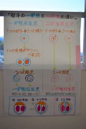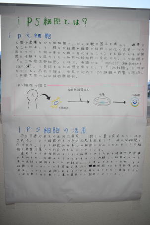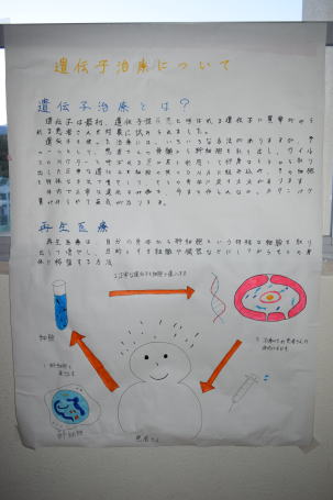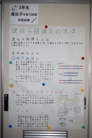 本日は理科室付近に掲示してある3年生の学習成果についてお知らせします。3年生は「遺伝」について調べ学習をしました。各グループごとに調べたテーマは以下の6つです。『遺伝子組み換えの方法』,『DNA鑑定について』,『遺伝子組み換え食品とその可能性』,『双子の一卵性と二卵性の違い』,『遺伝子治療について』,『ips細胞とは?』あなたはどれに興味を持ちましたか?興味を持った鰍中生は理科室付近廊下の掲示物をじっくり読んでみましょう。