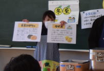 今日は冬至です。冬至にはかぼちゃを食べて柚子湯に入る習慣があります。冬至にかぼちゃを食べると風邪を引かないとか金運が上がると言われています。本日の給食は冬至にちなんでかぼちゃ料理とゆず料理が登場しました。かぼちゃ料理では「うまいもんだよ南瓜のほうとう」という言葉で有名な「ほうとう」に似た富士川町の郷土料理「みみ」が登場しました。今日のために「つくたべかん」の方々が34kgもの「みみ」を作ってくださったそうです。ゆず料理では鮭のゆずみそ焼きが登場しました。愛情のこもった給食をいただき,風邪だけでなくコロナも吹き飛ばせそうな気がしました。