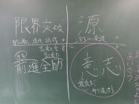 今日は,3年生が登校し,学級目標の決定を行いました。候補に残った言葉の中から中学校生活最後の学級目標を多数決で決定しました。候補の残った言葉は「源」・「限界突破」・「前進全励」・「意志」の4つでした。「源」は「学校の中心は3年生!3年生から色んなことを発信していこう!」という思い,「限界突破」は「これまでの自分たちの殻を破り,新しい境地を切り拓こう!」という思い,「前進全励」は「これから先,待っているであろういくつもの苦楽を全員で,全力を出して,前向きな気持ちで進んでいこう!」という思い,そして「意志」は「先が見えない不安もあるけれど,どんなことも最後までやり遂げよう!」という強い思いがこめられています。投票の結果,「意志」に決定しました。「意志」という字をよく見ると,「心」という字が2つ入っています。2つ並んだ心の字が,「辛い時でも1人じゃないんだよ!」と元気づけてくれているように感じられます。今まで誰も経験したことのない手探りの学校生活がいよいよ始まろうとしています。不安や戸惑いもあると思いますが,強い意志を持ち,どんな困難も乗り越えていきましょう!